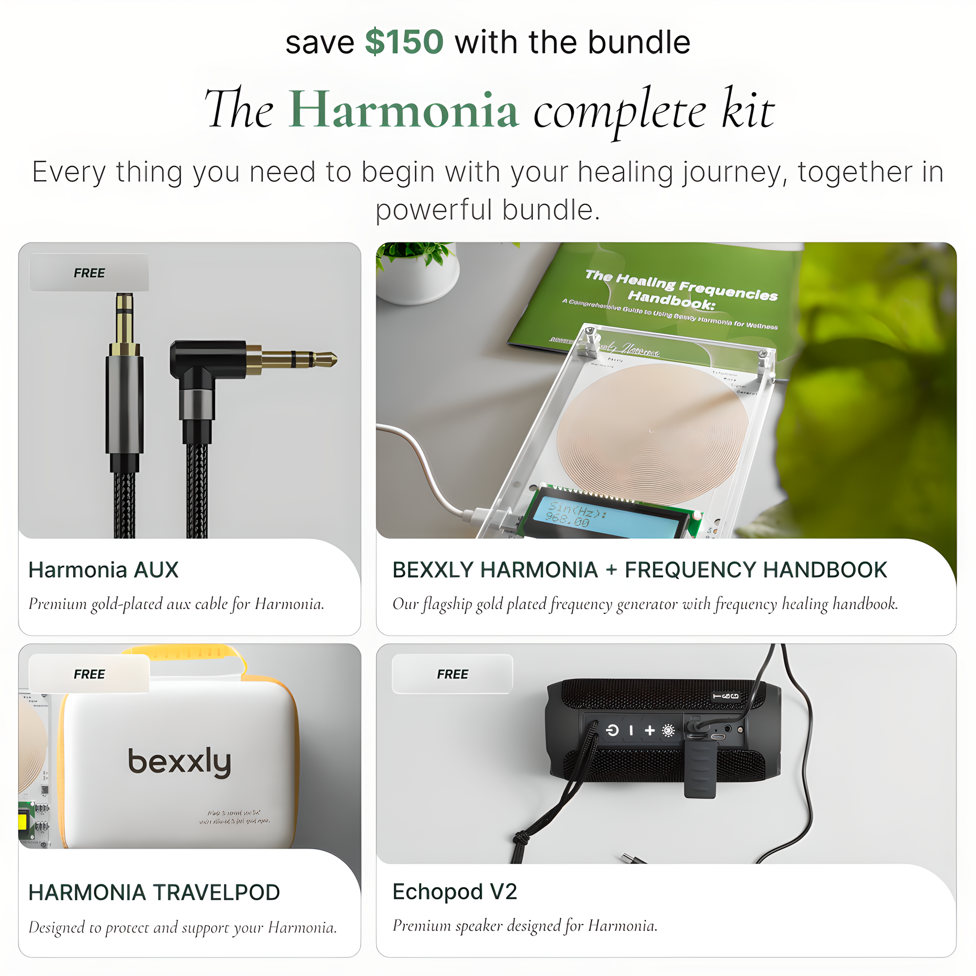 Harmonia is the core device plus Handbook and USB-C cable. The Complete Kit adds the WAVES frequency speaker, the TravelPod protective carry case, an upgraded Handbook edition, and a branded AUX cable.
